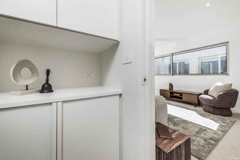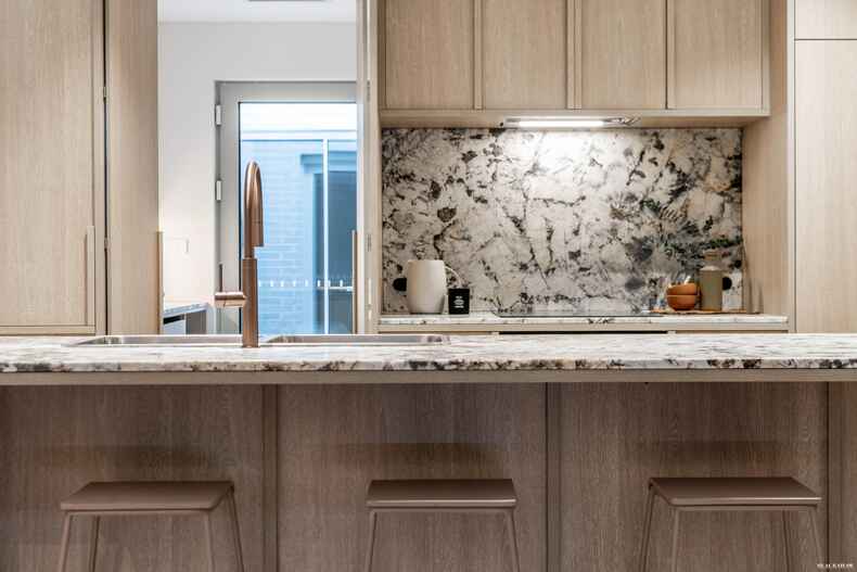 Each residence at The Menzies has been meticulously designed to create a sustainable and healthier living environment. Advanced glazing systems in every window and glass door provide superior insulation and solar control, resulting in an impressive 7.8-star energy rating. Not only does this make the homes more energy-efficient, but it also offers exceptional noise reduction and internal comfort. Kitchens are fitted with high-end, integrated AEG appliances, natural stone benchtops, and an abundance of storage, making cooking a pleasure. Bathrooms and ensuites feature customised joinery and premium fittings that elevate every aspect of daily living.