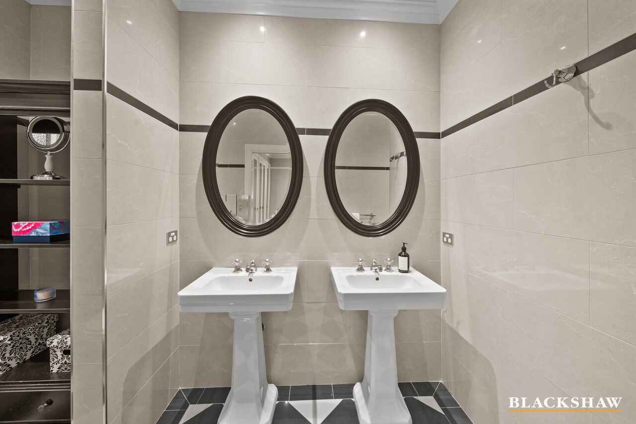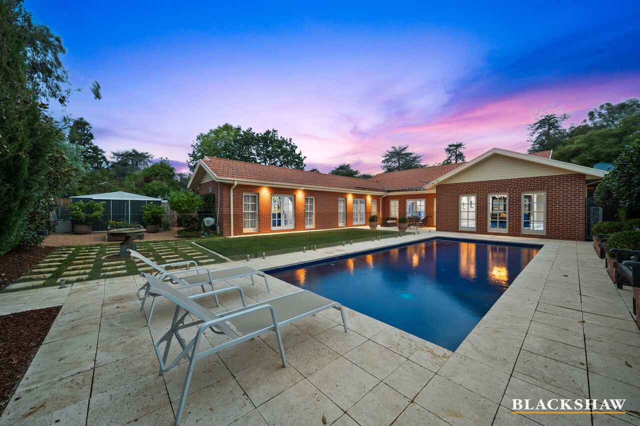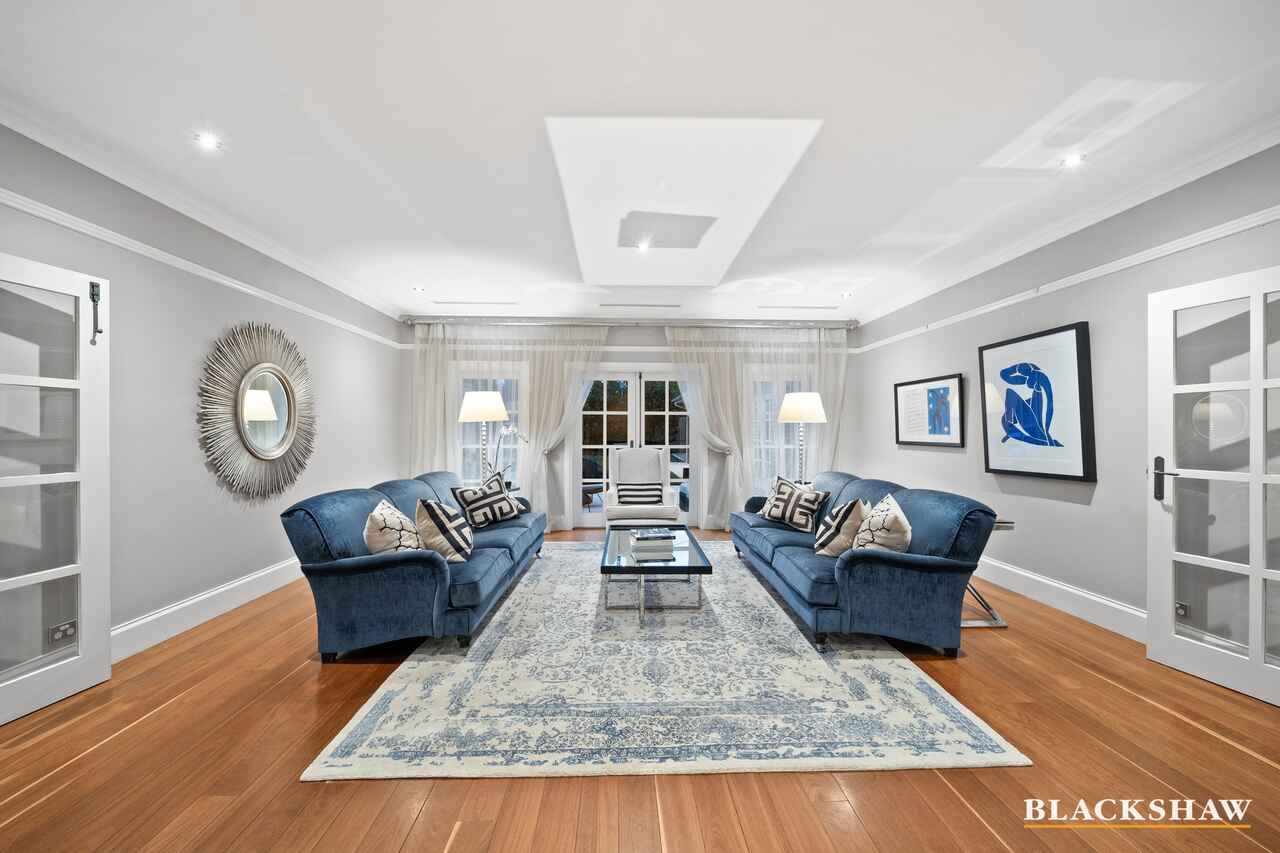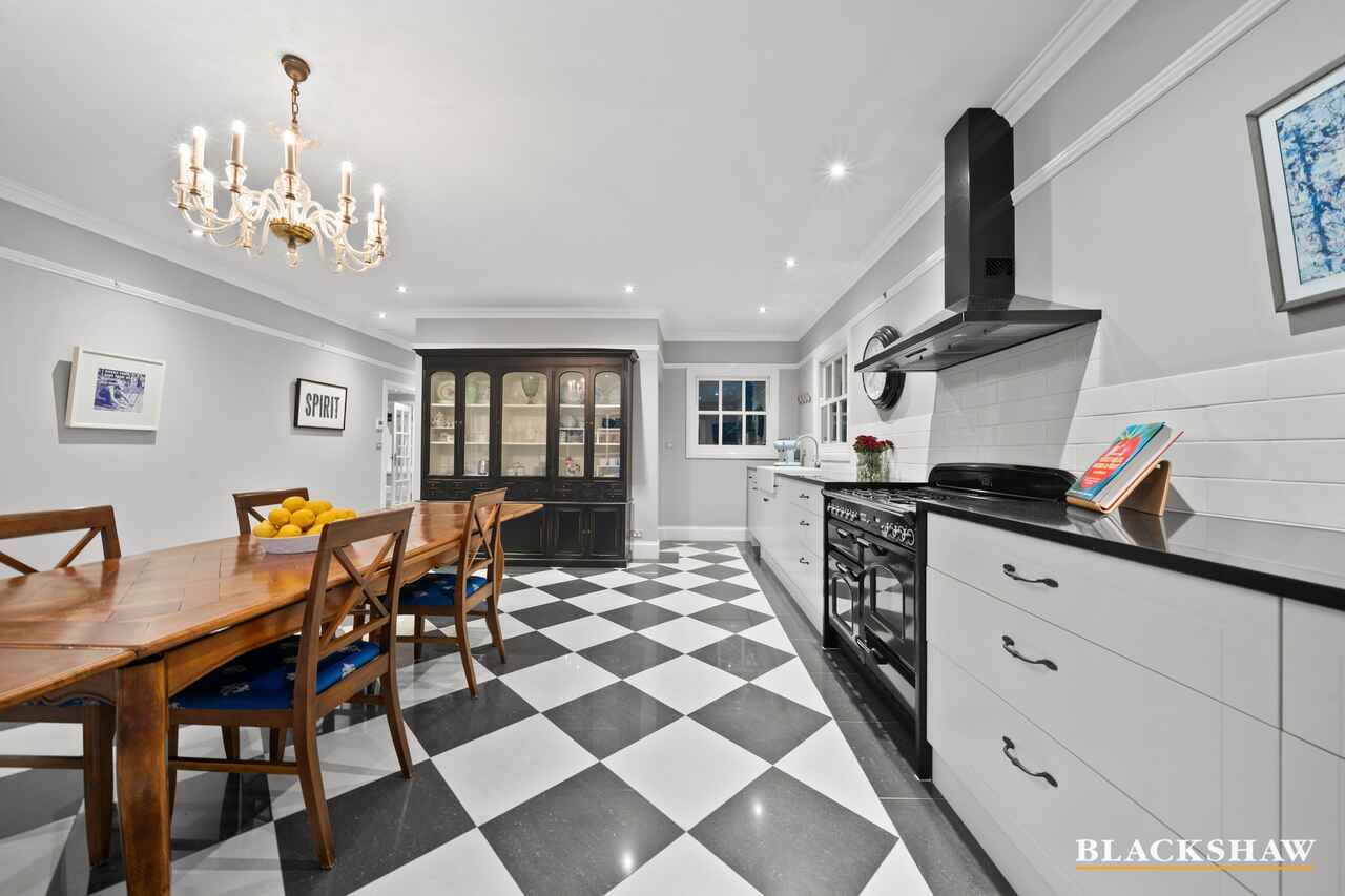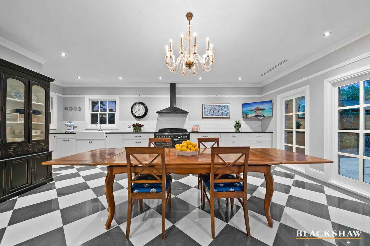 The home's gourmet kitchen is an absolute showpiece, featuring stylish marble benches, premium appliances including a Falcon range with multiple cooking functions, complemented by a large well-designed scullery. The meals and kitchen areas also display an elegant 1930s Murano glass chandelier, with refined chequered porcelain flooring underneath which flows out to an inviting entertaining area. This area also boasts a very tasteful rain-and-wind sensor-activated awning, overlooking the stunning resort-style pool, surrounded by the sculptured formal gardens, perfectly framed by Mount Ainslie and mature trees.