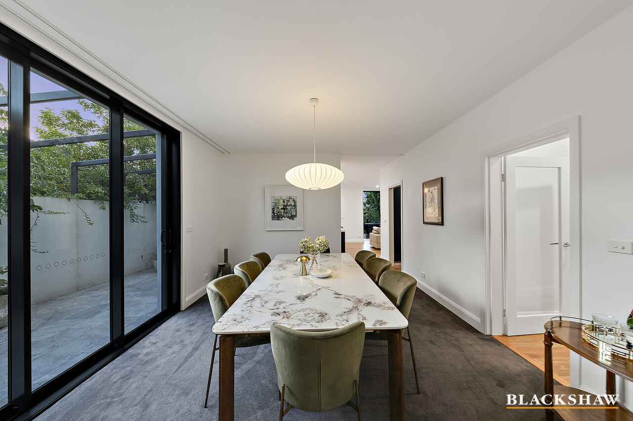 The formal lounge to the front is versatile for hosting guests year-round. Sliding doors open to a delightful terrace surrounded by landscaped gardens that feature beautiful flowering greenery edged with Canberra bluestone walls. A contemporary gas heater is a focal point in winter and the room is sufficiently large to be zoned with sectional furniture, plus a conversation nook or even a grand piano. A dining room adjacent is generous in size and is placed perfectly next to the formal lounge, kitchen, walk in pantry and wine room.