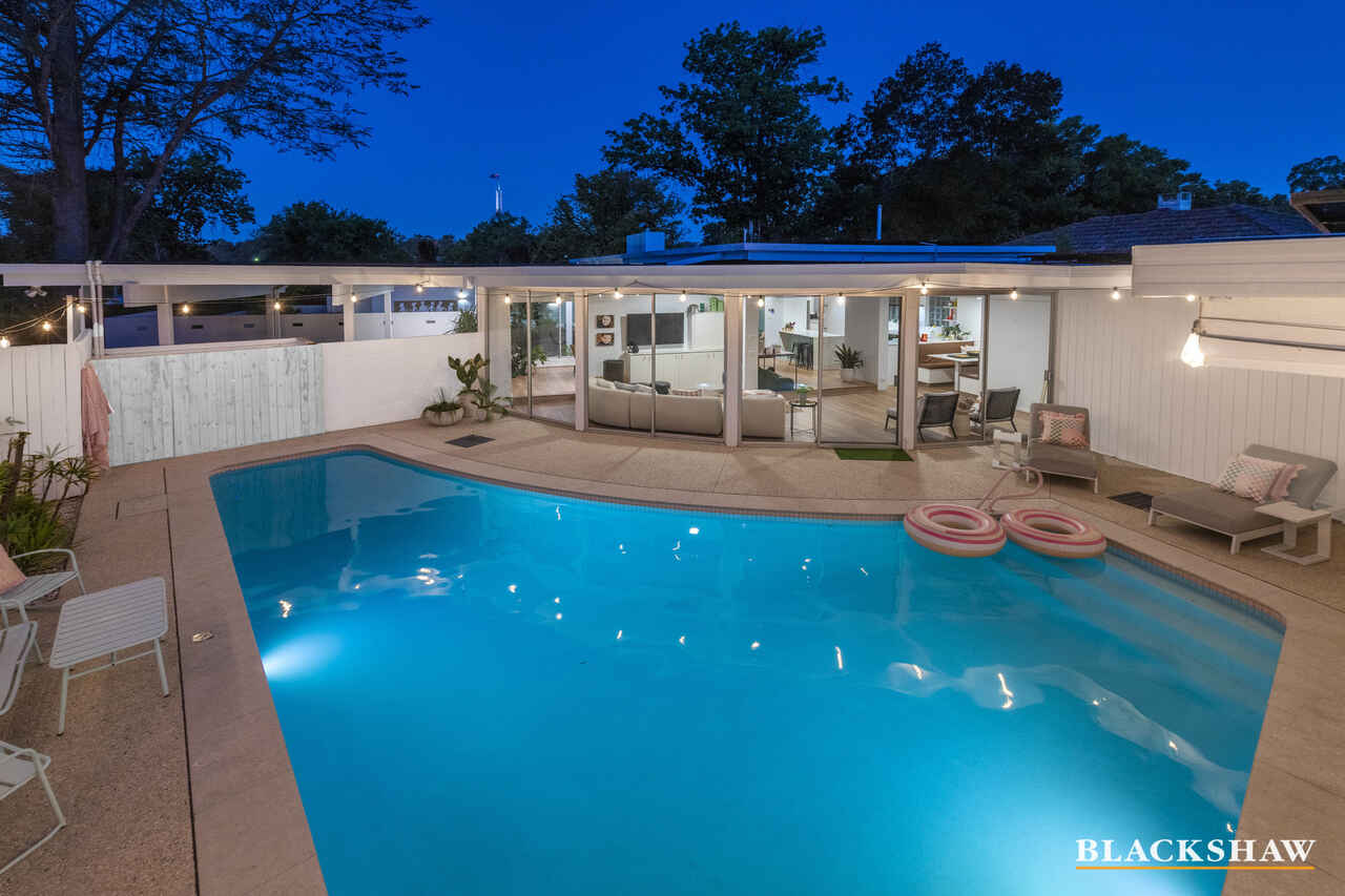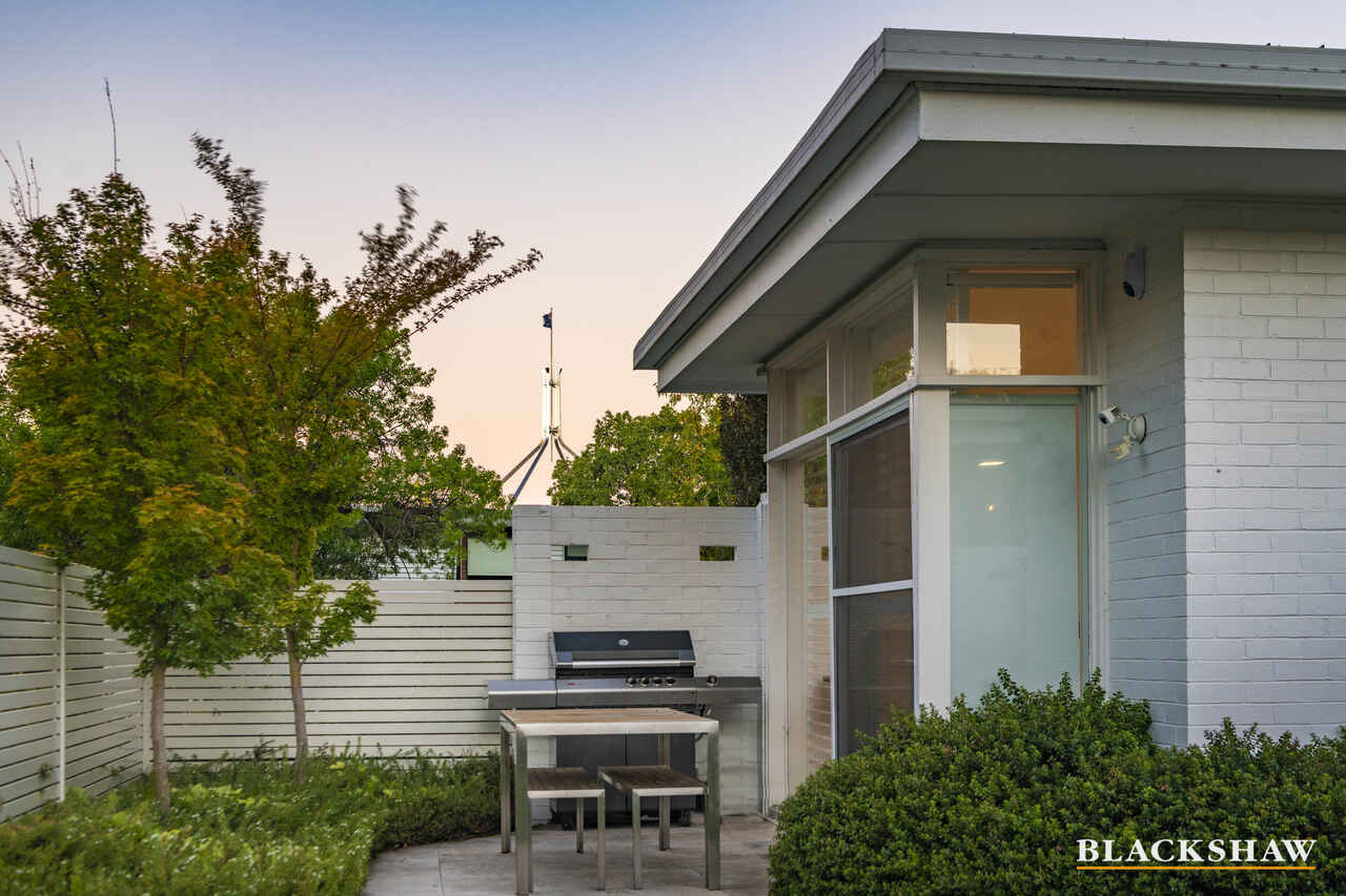 Set within one of Deakin's most tightly held and prestigious precincts, this iconic Palm Springs–inspired residence presents a rare fusion of architectural pedigree, contemporary luxury, and exceptional future opportunity. Positioned opposite the Prime Minister's Lodge and surrounded by established parkland, the home occupies a magnificent 1,452m² (approx.) land holding with lush, private, garden surrounds.